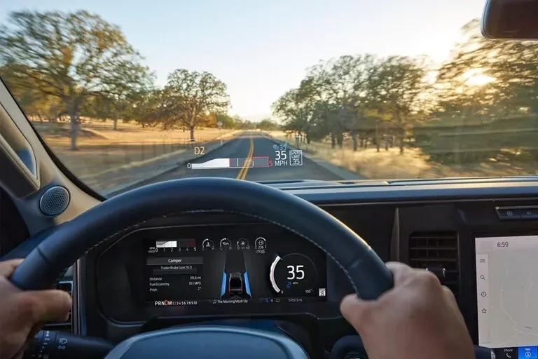 New to Super Duty® pickups, available Head-Up Display* (HUD) helps you keep your eyes fixed firmly on the road while having important information projected onto the windshield in your line of sight without being intrusive. Like speed limit, driver assist details and more. Plus, you can customize the information you see and the location on the windshield.