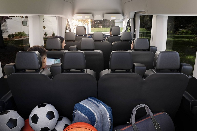 - 15-Passenger Seating. 1st row: 2 seats, 2nd row: 3 seats, 3rd row: 3 seats, 4th row: 3 seats, 5th row: 4 seats. Optional with Long Length Passenger Van